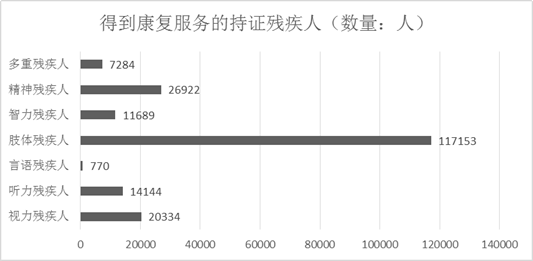 2019年,199551名残疾儿童及持证残疾人得到基本康复服务,其中包括0-6岁残疾儿童2299人。得到康复服务的持证残疾人中,有视力残疾人20334名、听力残疾人14144名、言语残疾人770名、肢体残疾人117153名、智力残疾人11689名、精神残疾人 26922名、多重残疾人7284名,未持证残疾儿童1255 名。全年共为58148名残疾人提供各类辅助器具适配服务。