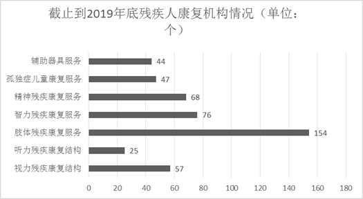 截至2019年底,已有残疾人康复机构289个,其中,57个机构提供视力残疾康复服务,25个提供听力言语残疾康复服务, 154个提供肢体残疾康复服务,76个提供智力残疾康复服务,68 个提供精神残疾康复服务,47个提供孤独症儿童康复服务,44个提供辅助器具服务。