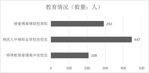 共有特殊教育普通高中班(部)5个,在校生116人,均为聋生。残疾人中等职业学校(班)2个,在校生447人,毕业生100人,毕业生中4人获得职业资格证书。有292名残疾人被普通高等院校录取,208名残疾人进入特殊教育学院学习。