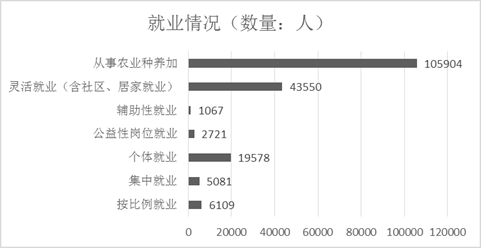 城乡持证残疾人就业人数为184010人,其中按比例就业6109人,集中就业5081人,个体就业19578人,公益性岗位就业2721人,辅助性就业1067人,灵活就业(含社区、居家就业)43550人,从事农业种养加 105904 人。