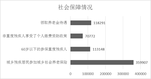 截至2019年底,残疾居民参加城乡社会养老保险人数359907名,113148名60岁以下参保重度残疾人中,106452名得到政府的参保扶助,享受代缴比例达到94.1%。70772 名非重度残疾人享受了个人缴费资助政策。118291人领取养老金。