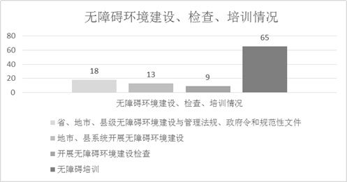 无障碍建设法规、标准进一步完善。共出台了18个省、地市、县级无障碍环境建设与管理法规、政府令和规范性文件;13个地市、县系统开展无障碍环境建设;开展无障碍环境建设检查9次,无障碍培训65人次。