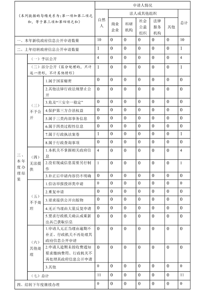 (二)依申请公开信息办理情况。2025年依法规范办理政府信息公开11件(含2024年度转办1件),已全部在规定时间内办结。予以公开及部分公开5件,占比45.5%;不予公开1件,占比9%;无法提供、不予处理、其他处理等5件,占比45.5%;根据国务院办公厅关于政府信息公开信息处理费管理有关规定,2025年无达到收费标准的申请事项,未向申请人收取信息处理费用;信息公开工作无行政复议、行政诉讼案件。