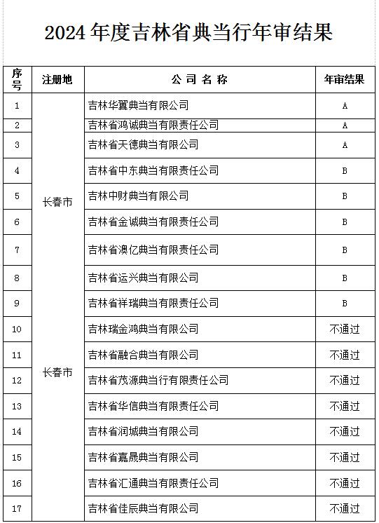 | 标 题: | 吉林省地方金融管理局关于2024年度典当行年审结果的公示 |