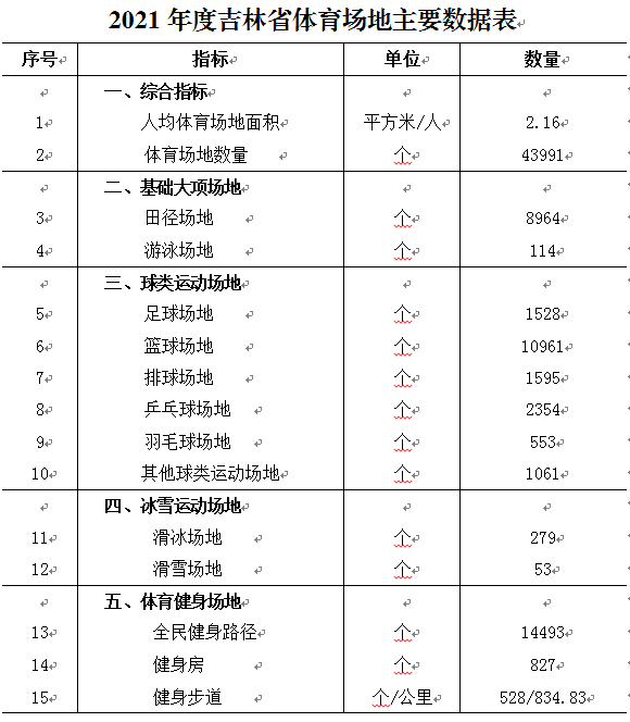 根据《体育总局办公厅关于开展2021年度体育场地统计调查工作的通知》(体经字〔2021〕366号)要求,吉林省体育局开展了以2021年12月31日为标准时点,调查对象为全省(不含军警部队和铁路系统)可供居民开展运动训练、比赛和健身等的各类体育场地统计调查工作。现将统计调查数据公告如下: