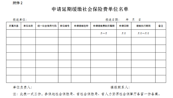 2.2020年2月起,符合条件的参保单位可通过登录吉林省社会保险局网站(http://jlsi.jl.gov.cn)填报《延期缴纳社会保险费申请审核表》,并提供单位生产经营困难情况说明及2020年2月份以来的单位财务报表、工资和生活费发放明细。